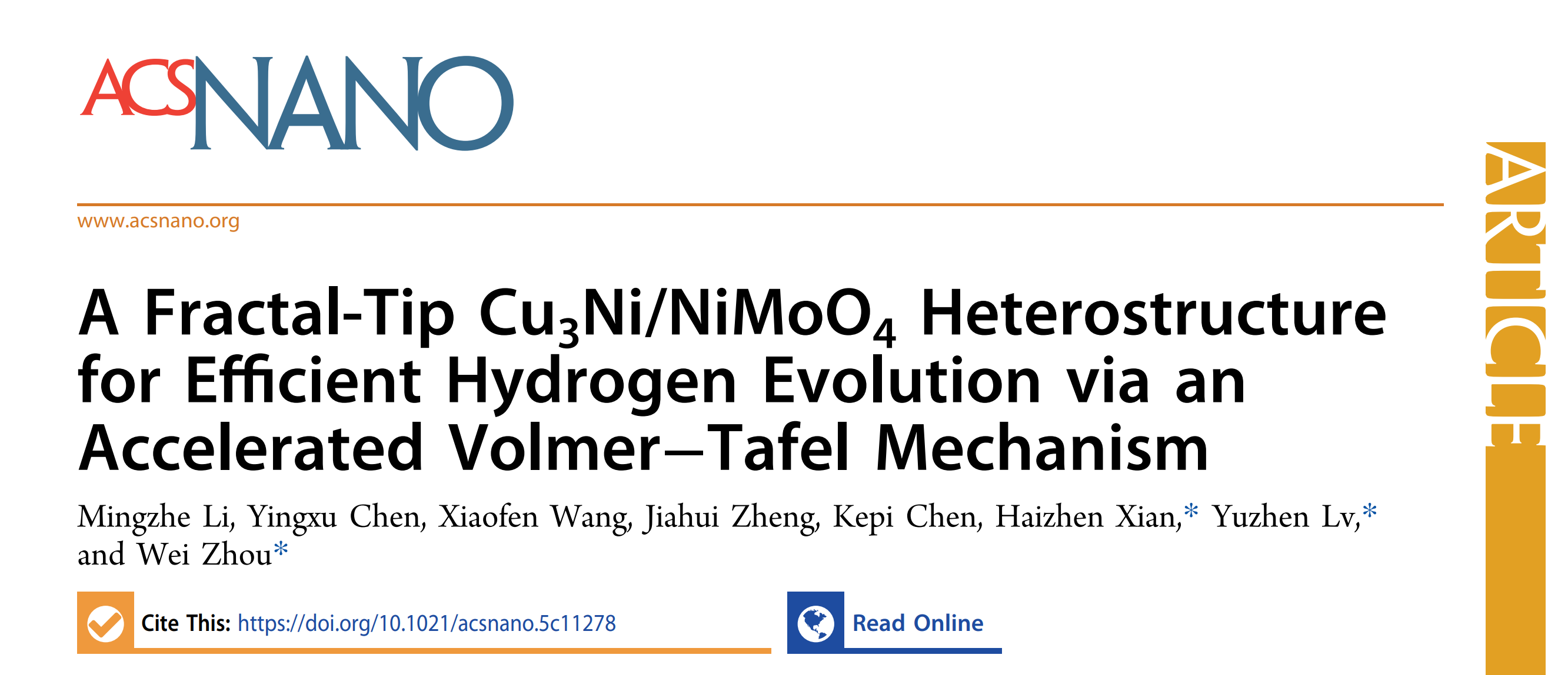 近日,巨乳人妻 吕玉珍教授、冼海珍教授与北京航空航天大学的周苇教授合作在非贵金属催化碱性电解水制氢研究中取得重要突破。研究团队在国际知名期刊《ACS Nano》上发表了题为“A Fractal-Tip Cu3Ni/NiMoO4 Heterostructure for Efficient Hydrogen Evolution via an Accelerated Volmer−Tafel Mechanism”的研究论文,巨乳人妻 为第一完成单位。冼海珍教授、吕玉珍教授和周苇教授为共同通讯作者,巨乳人妻 博士研究生李明哲、陈盈旭为第一和第二作者。