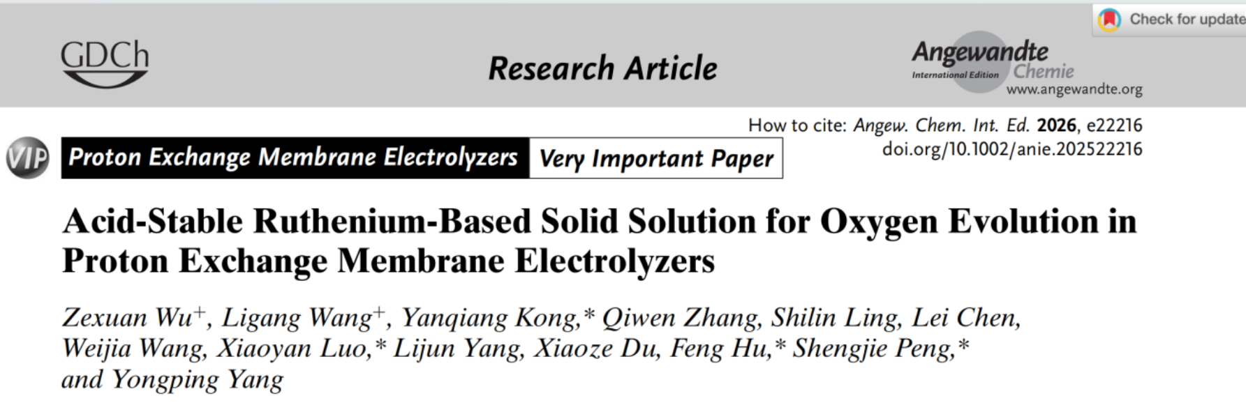 学术成果—孔艳强副教授在Angewandte Chemie International Edition发表用于PEM电解水制氢的酸稳定钌基固溶体催化剂研究论文