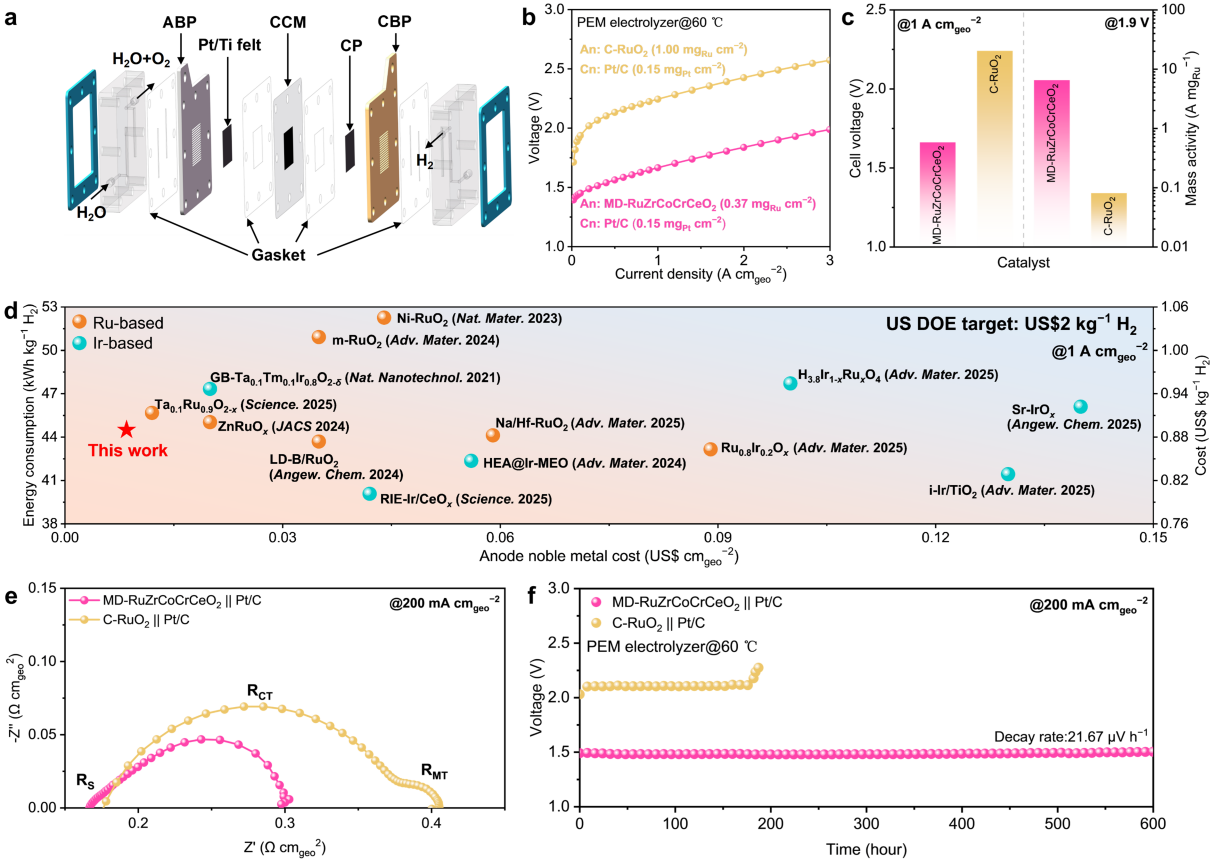 图6. PEM电解槽中MD-RuZrCoCrCeO2的酸性OER性能。a) 自制PEM电解槽示意图。b) 使用合成的MD-RuZrCoCrCeO2或C-RuO2作为阳极、40 wt.% Pt/C作为阴极的PEM电解槽未经iR校正的极化曲线。c) PEM电解槽达到1 A cm−2的电池电压,以及MD-RuZrCoCrCeO2和C-RuO₂||Pt/C电池在1.9 V下的质量活性。d) 在1 A cm−2下,MD-RuZrCoCrCeO2与已报道的阳极电催化剂的经济性分析。e) 在200 mA cm−2下,MD-RuZrCoCrCeO2和C-RuO₂||Pt/C电池的GEIS图比较。f) PEM电解槽中MD-RuZrCoCrCeO2和C-RuO2在200 mA cm−2下的计时电位曲线。