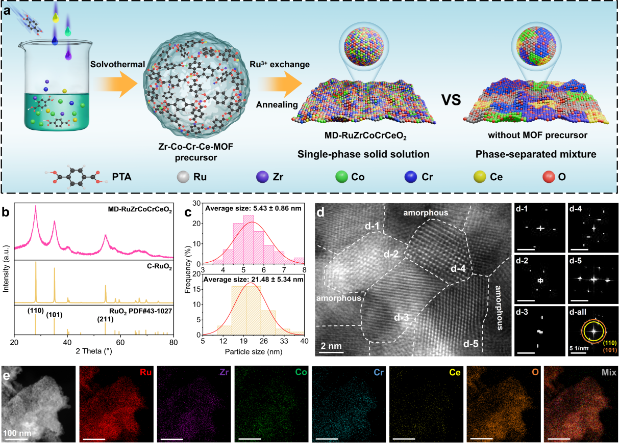 图1. MD-RuZrCoCrCeO2的合成与结构表征。a) 合成过程示意图。b) MD-RuZrCoCrCeO2和C-RuO2的XRD图谱。c) MD-RuZrCoCrCeO2(上)和C-RuO2(下)的纳米颗粒尺寸分布。d) MD-RuZrCoCrCeO2的HAADF-STEM图像,白色虚线标记出丰富的晶界(左)。从纳米颗粒获得的相应FFT图像(右)。e) MD-RuZrCoCrCeO2的HAADF-STEM图像及相应的元素分布图。