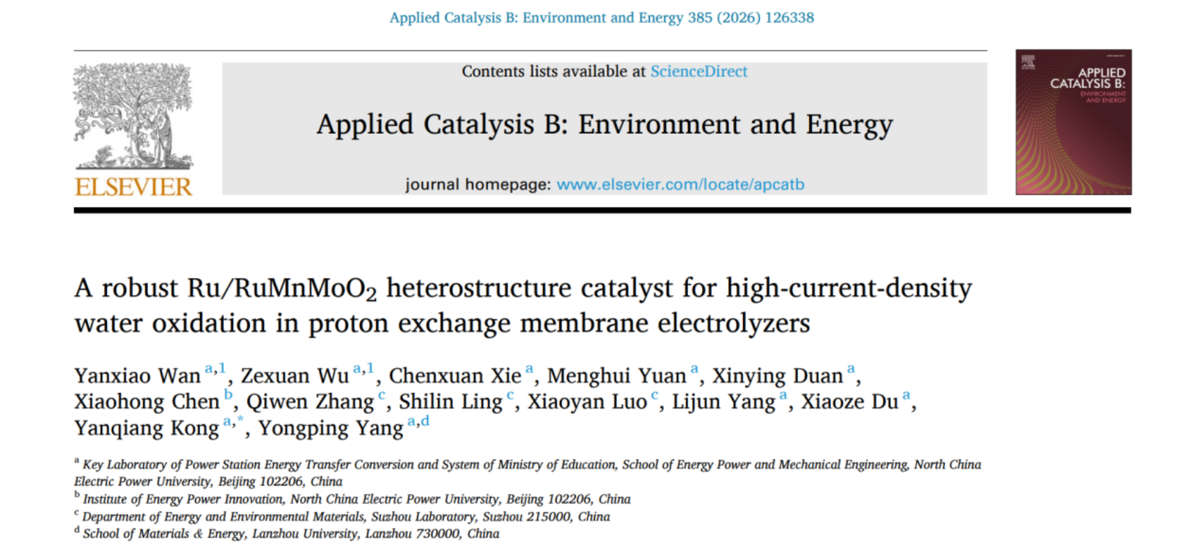 近日,巨乳人妻 孔艳强副教授在《Applied Catalysis B: Environment and Energy》期刊在线发表了题为“A robust Ru/RuMnMoO2 heterostructure catalyst for high-current-density water oxidation in proton exchange membrane electrolyzers”的研究论文,巨乳人妻 为论文第一完成单位,巨乳人妻 硕士研究生万延笑、博士研究生吴泽轩为第一作者,孔艳强为通讯作者。该研究工作得到了国家自然科学基金的资助。